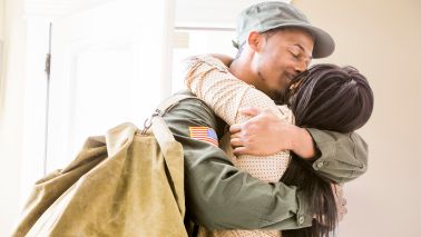 Gettyimages.com/Returning soldier kissing wife in hallway