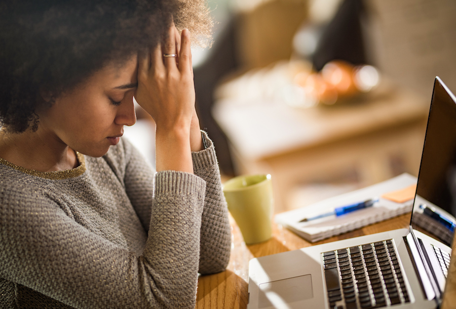 Gettyimages.com/Young black woman having pain in her head from working on laptop at home.