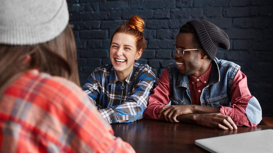 Bigstockphoto.com/African man wearing hipster black hat and glasses and pretty girl with ginger hair talking to their common female friend in red checkered shirt having nice time together during breakfast at cafe