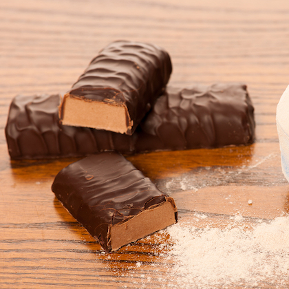 Bigstockphoto.com/Whey protein powder in measuring scoop and chocolate protein bar on wooden background.